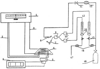 1 - регулятор температуры; 2 - подключение термопар; 3 - подводка электропитания; 4 - милливольтметр; 5 - измеритель теплового потока; 6 - радиационная панель; 7 - подвижная горелка; 8 - вспомогательная горелка; 9 - втулка для подсоединения подвижной горелки к системе питания топливом; 10 - невозвратные клапаны; 11 - игольчатый вентиль; 12 - редуктор; 13 - расходомеры; 14 - фильтры; 15 - игольчатые вентили; 16 - редукторы-регуляторы давления; 17 - подвод сжатого воздуха; 18 - пропан Рисунок А12 - Принципиальная схема установки и вспомогательного оборудования
