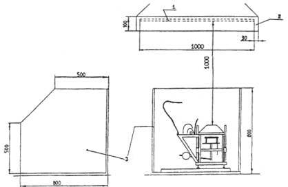 1 - отражатель; 2 - зазор (по всем кромкам отражателя); 3 - защитные экраны Рисунок А13 - Вытяжной зонт и защитный экран установки для испытаний на воспламеняемость