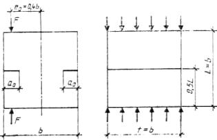 Кc, Значения Rbt, Rbtf, Еb определяют по приложению 4. 1.4. Определяемые по настоящему стандарту характеристики трещиностойкости (наряду с другими характеристиками механических свойств) используют для: сравнения различных вариантов состава, технологических процессов изготовления и контроля качества бетонов; сопоставления бетонов при обосновании их выбора для конструкций; расчетов конструкций с учетом их дефектности и условий эксплуатации; анализа причин разрушений конструкций. 2. ОБРАЗЦЫ2.1. Для определения характеристик трещиностойкости при равновесных испытаниях применяют образцы типа 1 - для испытаний на изгиб (черт. 1). 2.2. Для определения характеристик трещиностойкости при неравновесных испытаниях применяют образцы типов 1 - для испытаний на изгиб (черт. 1), 2 - для испытаний на осевое растяжение (черт. 2), 3 - для испытаний на внецентренное сжатие (черт. 3), 4 - для испытаний на растяжение при раскалывании (черт. 4). 2.3. Соотношение размеров и схемы нагружения образцов приведены на черт. 1 - 4. Минимальные размеры образцов и размеры начальных надрезов принимают по таблице в зависимости от размера зерна заполнителя dam. 2.4. Начальные надрезы наносят при помощи режущего инструмента или при формовании образцов путем закладывания фольги либо латунной (или стальной) пластины. Ширина начального надреза не должна превышать 0,5 dam и быть не более 2 мм. 2.5. Образцы для испытаний изготавливают по ГОСТ 10180 сериями не менее чем из четырех образцов-близнецов каждая, либо выбуривают (выпиливают) из изделий, конструкций, сооружений по ГОСТ 28570. Тип 1 Образец - призма квадратного поперечного сечения для испытания на изгиб силой F в середине пролета. Тип 2 Образец - призма квадратного поперечного сечения для испытания на осевое растяжение силой F. Тип 3 Образец - куб для испытаний на внецентренное сжатие силой F. Тип 4 Образец - цилиндр дли испытаний на растяжение при раскалывании. Примечание к черт. 1 - 4. Обозначения приведены в приложении 1, размеры образцов - в таблице. мм