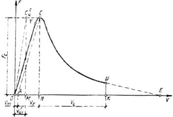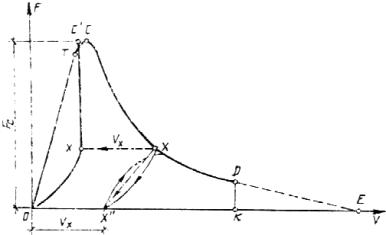 д) из точки М восстанавливают перпендикуляр е) для определения величин Кc, Gce из расчетной полной диаграммы построением выделяют полную упругую диаграмму OТС¢Х¢O (черт. 6), для чего используют направления линий разгрузок, например, точку разгрузки Х переносят по линии, параллельной оси ОV, в положение X¢ на величину, равную Vx. 5.1.2. Расчетным путем или