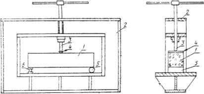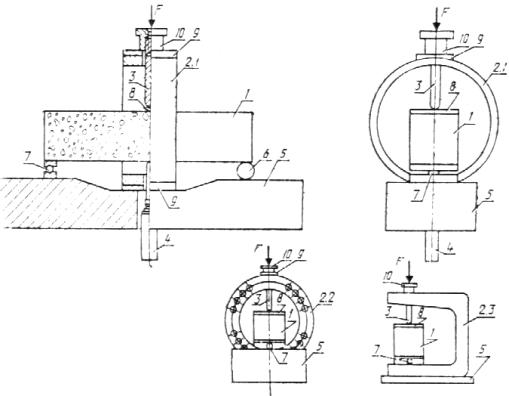 ПРИЛОЖЕНИЕ 3Рекомендуемое ОПРЕДЕЛЕНИЕ ХАРАКТЕРИСТИК ТРЕЩИНОСТОЙКОСТИ ПРИ РАВНОВЕСНЫХ ИСПЫТАНИЯХ ОБРАЗЦОВ С ФИКСАЦИЕЙ РАЗМЕРОВ РАЗВИВАЮЩЕЙСЯ МАГИСТРАЛЬНОЙ ТРЕЩИНЫ И СООТВЕТСТВУЮЩИХ ЗНАЧЕНИЙ ПРИЛАГАЕМОЙ НАГРУЗКИ1. Для определения характеристик трещиностойкости производят поэтапное нагружение (с выдержками продолжительностью 60 - 120 с и фиксацией текущих значений Fij и аij) образцов типов: 5 - для испытаний на осевое сжатие (черт. 7); 6 - для испытаний на растяжение при внецентренном сжатии (черт. 8). 2. Соотношение размеров и схемы нагружения образцов приведены на черт. 7, 8. Минимальные размеры образцов: типа 5 - b ³ 12 dam; типа 6 - b ³ 15 dam. 3. Для определения значений величин аij применяют капиллярный и оптический способы. Капиллярный способ основан на эффекте капиллярной адсорбции подкрашенных, люминесцирующих или быстроиспаряющихся жидкостей в трещины. На поверхность образца наносят кистью ацетон, который испаряется с поверхности быстрее, чем из трещины, что позволяет идентифицировать длину развивающейся магистральной трещины. Оптический способ основан на использовании средств оптической микроскопии; следует применять микроскопы с не менее чем 20-кратным увеличением по ГОСТ 8074. 4. Определение характеристик трещиностойкости 4.1. Дли каждого этапа нагружения определяют значение Kij по зависимостям: Тип 5 Образец - призма прямоугольного поперечного сечения для испытаний на осевое сжатие. Тип 6 Образец - призма прямоугольного поперечного сечения для испытаний на растяжение при внецентренном сжатии. Примечание к черт. 7 и 8. Обозначения приведены в приложении 1, размеры образцов - в приложении 3. - для образца типа 5. - для образца типа 6. 4.2. По результатам п. 4.1. строят зависимость Kij - aij; за величину Ki принимают среднее значение Kij на участке зависимости, где тангенс угла ее наклона отличается от нуля не более чем на 8 %. ПРИЛОЖЕНИЕ 4Рекомендуемое ОПРЕДЕЛЕНИЕ ПРЕДЕЛА ПРОЧНОСТИ НА РАСТЯЖЕНИЕ И НАЧАЛЬНОГО МОДУЛЯ УПРУГОСТИ1. Значение Rbt определяют при равновесных испытаниях образцов типа 1 и типов 5, 6 (согласно приложению 3) по зависимости 2. Значение Rbtf определяют при равновесных испытаниях образцов типа 1 по зависимости 3. Значение Eb определяют при равновесных испытаниях образцов типа 1 с l ~ 0,1 - 0,5 по зависимости ПРИЛОЖЕНИЕ 5Обязательное ИСПЫТАТЕЛЬНОЕ ОБОРУДОВАНИЕ ДЛЯ ОПРЕДЕЛЕНИЯ ХАРАКТЕРИСТИК ТРЕЩИНОСТОЙКОСТИ ПРИ РАВНОВЕСНЫХ ИСПЫТАНИЯХ ОБРАЗЦОВ ТИПА 1Для определения характеристик трещиностойкости при равновесных испытаниях образцов типа 1 используют специальные испытательные машины со следящей системой и быстродействующей обратной связью или испытательные машины, обладающие высокой жесткостью (не менее чем в два раза превышающей начальную жесткость образца (черт. 9), или стандартные испытательные машины по п. 3.1, оборудованные дополнительным перераспределяющим устройством (черт. 10) типа «кольцо», включающим в себя: силовой элемент - кольцо; нагружающий силоизмеритель - шток; датчик перемещения; опорную плиту с шарнирной и роликовой опорами. Испытания рекомендуется проводить на установке ПРДД-3 экспериментального объединения «Реконструкция», которое распространяет чертежи, методики аттестации и поставляет оборудование. 1 - образец; 2 - загружающее устройство; 3 - нагружающий винтовой силоизмерительный шток; 4 - распределительная балка, 5 - ролик