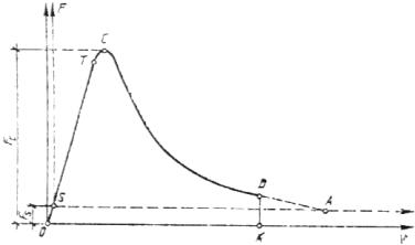 на части с фиксацией значения 5. ОБРАБОТКА РЕЗУЛЬТАТОВ5.1. Определение характеристик трещиностойкости по результатам равновесных испытаний образцов типа 1. 5.1.1. Полную диаграмму состояния трансформируют в расчетную и производят дополнительные построения (черт. 5): а) с начала прямолинейного нисходящего участка диаграммы, то есть из точки D, где выполняется условие (dF/dV) ~ const, проводят отрезок DK, перпендикулярный оси OV; б) фиксируют расчетную диаграмму ОТСDK; в) из точки С опускают перпендикуляр СН к оси ОV и линию СА, параллельную упругой линии ОТ; г) определяют величину отрезка OM из выражения (1):