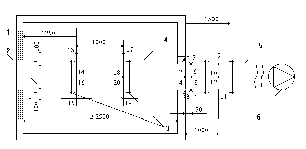 Рис. 1.1. Схема размещения горизонтальных воздуховодов на испытательном стенде: 1 - печь; 2 - заглушенный торец образца; 3 -
