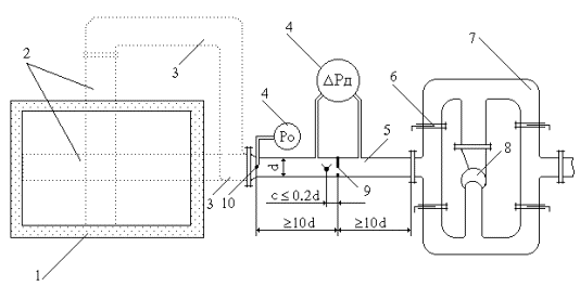 воздуховоды обвязки вентилятора; 8 - вентилятор; 9 - расходомерная диафрагма;