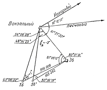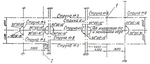 где d1-2 - поправка в направление 1-2; x1 - абсцисса пункта 1; x2 - абсцисса пункта 2; ym - средняя ордината пунктов 1 и 2; R = 6370 км; r = 206265²; Абсциссы и ординаты выражаются в километрах, поправки d получаются в секундах. Примечание. Для выбора величин у и х (к формулам, пп. 1.38 и 1.40) пользуются масштабной схемой цепи, на которой должна быть нанесена координатная сетка. 1.41. Перед уравновешиванием триангуляции производится полная проверка журналов измерений, всех полевых вычислений и схемы сети. Учитывая малость сторон тоннельных триангуляций, необходимо для вычисления поправок за центрировки и редукции получать предварительные длины этих сторон с достаточной степенью точности. 1.42. В результате полной проверки полевых материалов составляется список приведенных к центру и редуцированных на плоскость проекций Гаусса направлений и вычеркивается окончательная схема сети. Производится оценка точности угловых измерений по формуле