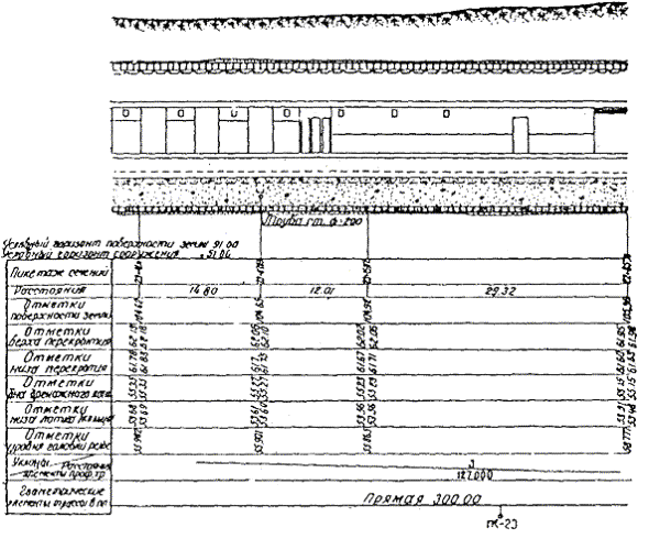 31.14. На продольных профилях в условных знаках показываются временная крепь, обделка и конструкция, границы железобетона и бетона, заполнительная и укрепительная цементация, дренажные устройства. На продольных профилях в местах, на которые составлены графические исполнительные поперечные сечения, подписываются отметки, расстояния, толщина обделок и конструкций.