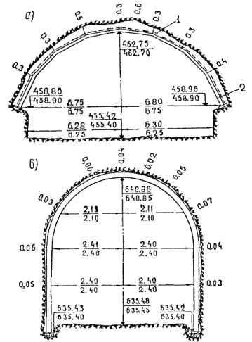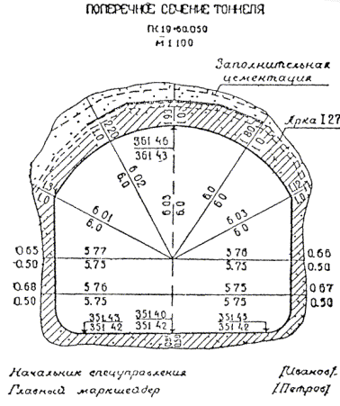 31.17. На поперечных сечениях подписываются проектная и фактическая толщина обделок стен, лотка, свода, расстояния от оси до стен, отметки лотка, свода. Для тоннелей, сооружаемых без обделок, указываются фактические расстояния от проектного контура до фактического. Образец сечения приведен в приложении 31-2.