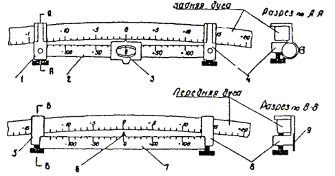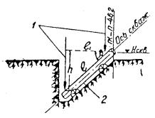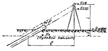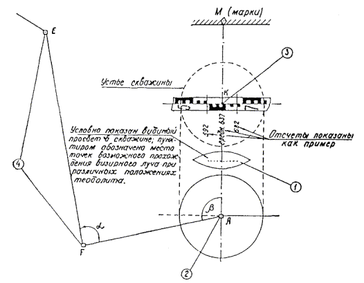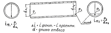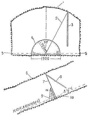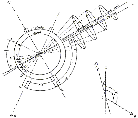 В указанных формулах: d - уклонение результата измерения секции одной проволокой в одном направлении от среднего значения, полученного по всем измерениям; n - число отдельных измерений; k - число секций. Г. Угловые измерения1.23. Для измерения углов тоннельных триангуляций используются теодолиты двухсекундной точности и оптические теодолиты. В горной местности, при наличии в цепи направлений со значительными углами наклона, необходимо применять инструменты с накладным уровнем. При отсутствии таких теодолитов разрешается наклон вертикальной оси вращения инструмента определять при помощи уровня на алидаде, цена деления которого не должна превышать 15². Поправки в измеренные направления, которые вводятся при углах наклона более 3°, вычисляются по следующей формуле