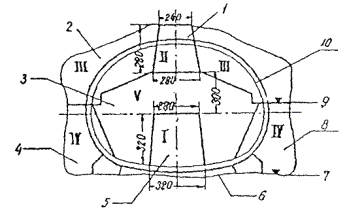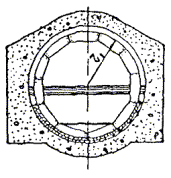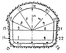31.16. На поперечных сечениях показываются в условных знаках: оси тоннелей, бетонная, железобетонная обделка стен, лотка, свода, временная крепь (арочная, анкерная, шприцбетонная), заполнительная, укрепительная цементации, дренаж. На поперечных сечениях показываются границы железобетонной, бетонной обделок, заполнительной цементации. Для тоннелей, сооружаемых без обделок, показывается проектный контур сечения и от него - фактический контур разработки.
