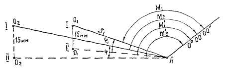 Пример. Наблюдения производятся оптическим теодолитом типа Т-2 с 10-минутным интервалом лимба девятью круговыми приемами. Начальные отсчеты на барабане будут около: I прием 1¢ VI прием 6¢ II ² 2¢ VII ² 7¢ III ² 3¢ VIII ² 8¢ IV ² 4¢ IX ² 9¢ V ² 5¢ Образец журнала измерения углов триангуляции приведен в приложении 1-3. 1.28. Ввиду малости сторон тоннельных триангуляций следует добиваться высокой точности центрирования над знаками как теодолита, так и визирных приспособлений. При наличии центрировок и редукций их элементы определяются с погрешностями, не превышающими величин, приведенных в табл. 1-5 (для линейных элементов е и е1) и табл. 1-6 (для угловых элементов Q и Q1). 1.29. Угловые измерения должны производиться только в условиях благоприятной видимости, при отчетливых изображениях. В отдельных случаях рекомендуется для обеспечения требуемой точности производить ночные наблюдения с применением искусственного освещения объектов визирования. 1.30. При угловых наблюдениях должно быть обеспечено соблюдение допусков, приведенных в табл. 1-7. Таблица 1-5