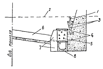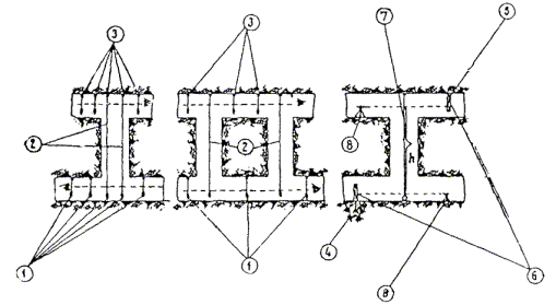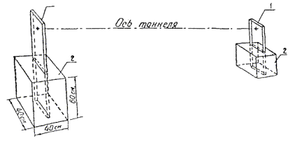 где L - общая длина тоннеля; l - среднее расстояние между смежными точками открытия фронта тоннельных работ. Б. Составление проекта, рекогносцировка и закрепление знаков1.05. Проект триангуляции составляется на плане или карте крупного масштаба, на которых должны быть показаны: проектируемая трасса, места расположения стволов, порталов, боковых штреков-штолен и все имеющиеся пункты ранее выполненных триангуляций. При отсутствии картографических материалов необходимого масштаба проект составляется в процессе производства рекогносцировки на местности. 1.06. Для решения вопроса об использовании сторон имеющихся триангуляций в качестве базисов производится исследование точности определения длин этих сторон. Если результаты исследования не удовлетворяют требованиям табл. 1-2, намечается измерение самостоятельных базисов. Расчет частоты базисов в проектируемой цепи производится в соответствии с требованиями табл. 1-1 и 1-2. Во всех случаях следует стремиться к измерению непосредственно сторон триангуляционной цепи. Одновременно с выбором базиса намечаются места закрепления знаков полевого компаратора, используемого при строительстве для компарирования мерных приборов. 1.07. Выбор исходных дирекционных углов сторон и координат пунктов городской или государственной триангуляции должен основываться на детальном изучении материалов этих триангуляций. Не могут быть использованы в качестве исходных пункты, определенные вставками в основную сеть. 1.08. Триангуляционные цепи должны представлять собою системы треугольников, близких по форме к равносторонним (желательно с диагональными направлениями). В треугольниках, не подкреплённых диагональными направлениями, связующие углы менее 40° не допускаются. 1.09. При построении триангуляции для сооружения тоннелей рекомендуется проектировать такое расположение пунктов, которое обеспечивало бы ориентирование каждых двух смежных стволов, штолен, порталов по одной и той же стороне триангуляции. 1.10. При производстве работ для сооружения тоннелей значительной длины в горной местности и в сложных геологических условиях принимаются необходимые меры для исключения возможных влияний уклонений отвесных линий на точность триангуляции. 1.11. Удаление линий визирования от любых боковых предметов должно быть не менее 1 м, а по высоте, от крыш зданий или поверхности земли - не менее 2 м. Следует избегать прохождения визирных лучей вблизи дымящих заводских труб и вытяжных труб на крышах домов. 1.12. При выборе мест закрепления триангуляционных знаков на крышах зданий необходимо учитывать как удобство пользования пунктом и безопасность подхода к нему, так и конструктивные качества той части здания, на которой намечается устройство триангуляционной надстройки. 1.13. При рекогносцировке знаков на незастроенной территории необходимо учитывать гидрогеологию грунтов и ситуационные условия. Знаки нельзя располагать вблизи линий электропередач, связи и т.д. Триангуляционные центры, как правило, должны располагаться в устойчивых, неоползневых и не подвергающихся выпучиванию грунтах. 1.14. Основным типом знака для незастроенных территорий следует считать такой, при котором измерения производятся со штатива, столба или при небольших поднятиях инструмента над землей. 1.15. Все включаемые в триангуляцио