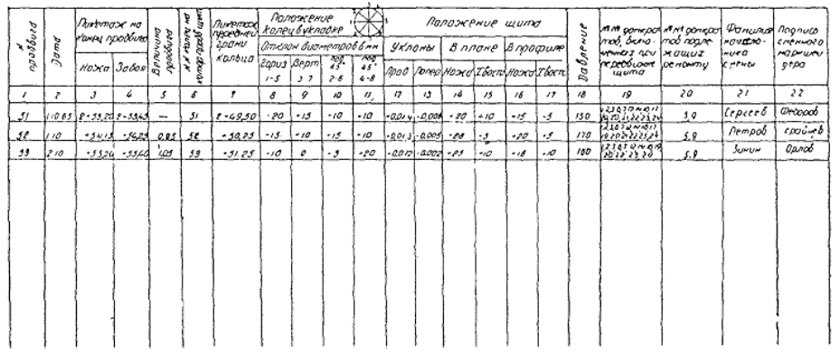 1.51. Составление проекта, рекогносцировка и закрепление знаков тоннельной полигонометрии производится по правилам, изложенным в разделе Б настоящей главы, а угловые измерения - в соответствии с методикой, изложенной в разделе Г. 1.52. Измерение длин сторон тоннельной полигонометрии производится свето- и радиодальномерами. При подборе типа дальномера необходимо учитывать, что точность линейных измерений при криволинейной форме сооружаемого тоннеля должна быть вдвое выше, чем при прямолинейной форме (см. табл. 1-10). Это вызвано тем, что при криволинейной форме трассы ошибки линейных измерений существенно влияют на поперечный сдвиг хода, который целиком входит в ошибку сбойки тоннелей. 1.53. Все угловые и линейные измерения производятся не менее чем дважды, с интервалом во времени не менее месяца. 1.54. При обработке материалов измерений тоннельной полигонометрии и составлении технического отчета руководствуются указаниями, изложенными в разделе Д настоящей главы. 1.55. Ходы тоннельной полигонометрии уравновешиваются на основе координат пунктов государственной или городской геодезической основы, если относительные ошибки их не превышают допусков табл. 1-10. В противном случае ход вычисляется как свободный. Приложение 1-1ЖУРНАЛ