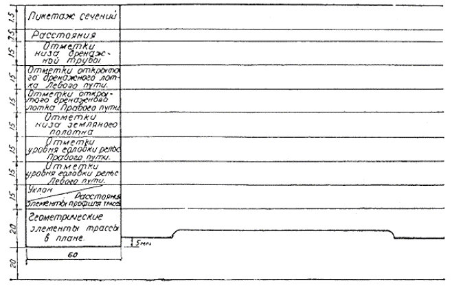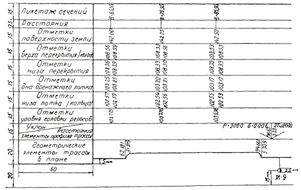 В легенде продольного профиля строительных и деривационных тоннелей показывается следующее: типы сечений и обделок, пикетаж графических поперечных сечений и характерных точек трассы, конструкции, расстояния, отметки поверхности земли, отметки свода, отметки лотка, отметки лотков дренажных устройств, уклоны и расстояния, геометрические элементы трассы в плане (см. приложение 31-1).