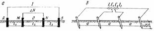 Рис. 8. Схема измерений для обнаружения блуждающих токов в земле 1 - медно-сульфатные электроды; 2 - изолированные провода; l3 - расстояние между измерительными электродами 2.3.14. При проведении измерения используют медно-сульфатные электроды сравнения, которые подбирают так, чтобы разность электродвижущей силы (э.д.с.) двух электродов не превышала 2 мВ. В качестве вольтметра используют высокоомные показывающие или самопишущие приборы (М.-231 или Н-399). Показания приборов рекомендуется отсчитывать через каждые 5-10 с в течение 10-15 мин в каждом пункте измерения. 2.3.15. Возможны два варианта расположения измерительных электродов на местности: параллельно будущей трассе сооружения, а затем перпендикулярно к оси трассы и в соответствии со сторонами света. Второй вариант наиболее удобен в тех случаях, когда изучаются коррозионные условия целого района, а также при сложной трассе подземного сооружения. 2.3.16. При проведении измерений необходимо особенно внимательно следить за подключением клемм прибора. Если одна из установок ориентирована по предполагаемой трассе трубопровода, то положительная клемма прибора должна подключаться к электроду, направленному в сторону начала трассы. Электроды, установленные перпендикулярно, следует подключать так, чтобы «нижний» электрод соединялся с положительной, а «верхний» - с отрицательной клеммой прибора. При расположении электродов по второму варианту электроды, ориентированные на юг и запад, соединяют с положительными клеммами соединительных приборов, а на север и восток - с отрицательными. Если измеряемая разность потенциалов имеет неустойчивый характер, т. е. изменяется по величине и знаку или только по величине, это указывает на наличие блуждающих токов от электрифицированного транспорта. Измерение разности потенциалов между трубопроводом и землей 2.3.18. Измерение разности потенциалов между трубопроводом и землей производят при помощи высокоомных показывающих или самопишущих приборов. 2.3.19. Положительная клемма измерительного прибора присоединяется к трубопроводу, а отрицательная - к электроду сравнения. 2.3.20. Измерение рекомендуется выполнять в контрольно-измерительных пунктах или существующих на трубопроводах устройствах (сифонах, задвижках, гидрозатворах, регуляторных станциях и узлах домовых вводов). 2.3.21. При проведении измерений на контрольно-измерительных пунктах соединительный провод от отрицательной клеммы вольтметра подключают к электроду сравнения контрольно-измерительных пунктов. В остальных случаях соединительный провод подключают к временному электроду сравнения. 2.3.22. Временные электроды сравнения устанавливают на минимальном расстоянии от трубопровода. Если электрод устанавливают на поверхности земли, то желательно поместить его над осью трубопровода. Если электрод устанавливают в колодце или камере, то располагают его на дне или в стенке на минимальном расстоянии от трубопровода. 2.3.23. В качестве электрода применяют неполяризующийся медно-сульфатный электрод сравнения. 2.3.24. При измерениях потенциалов с помощью показывающих приборов интервал между отсчетами принимают равным 5-10 с. Результаты измерений заносят в протокол измерений (ф. 1-3 прил. 2). 2.3.25. При измерениях в зоне влияния блуждающих токов трамвая с частотой движения 15-20 пар в 1 ч продолжительность изме