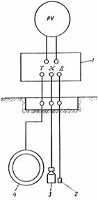 Рис. 16. Измерение сопротивления растеканию анодных заземлителей 1 - анодные заземлители; 2 - контрольно-измерительный пункт; 3 - измерительный прибор; 4 - измерительный электрод; 5 - питающий электрод; 6 - дренажный провод 6.2.14. Сопротивление защитного заземления электроустановок измеряют не реже одного раза в год. Схема измерения сопротивления защитного заземления такая же, как и на рис. 16. Измерения следует производить в наиболее сухое время года. 6.2.15. Эффективность действия протекторной защиты определяют измерением потенциала трубопровода по отношению к земле в точке подключения протектора при включенном и отключенном протекторе; величины тока в цепи протектор - защищаемое сооружение; потенциала протектора относительно земли до подключения к трубопроводу. Результаты измерения заносят в журнал (ф. 2-4а прил. 2). 6.2.16. Если потенциал трубопровода на участке подключения окажется меньше проектного (по абсолютной величине) или минимального защитного потенциала, необходимо проверить исправность соединительного провода между протектором и трубопроводом, места припайки его к трубопроводу и протектору. Если соединительный провод и места припайки его окажутся исправными, то производят активацию «обмазки». Если и после этого потенциал не увеличится, то делают шурф на глубину закопки электрода для его осмотра и проверки наличия вокруг него заполнителя. 6.2.17. При применении протекторной защиты с включением полупроводникового диода в цель между защищаемым сооружением и протектором необходимо проверить вентильное действие указанных диодов. 6.2.18. Исправность изолирующих фланцевых соединений проверяют не реже одного раза в год в соответствии с методическими указаниями (п. 5.4.2). При этом измеряют падение напряжения на изолирующем фланце и синхронно - разность потенциалов по обеим сторонам изолирующего фланца по отношению к земле. Измерение проводят при помощи двух милливольтметров. При исправном фланцевом соединении синхронный замер показывает «скачок» потенциала. Результаты измерения заносят в журнал проверки работ изолирующих фланцев (ф. 2-3а прил. 2). 6.2.19. При проверке изолирующих фланцев в колодцах прибор присоединяют к выводам КИП на поверхность люка колодца. 6.2.20. Текущий ремонт защитных установок выполняют в процессе эксплуатации на основании заключений технического осмотра. На время ремонта установку демонтируют и заменяют аналогичной из резерва. ЧАСТЬ VII. ОСНОВНЫЕ УКАЗАНИЯ ПО ТЕХНИКЕ БЕЗОПАСНОСТИ ПРИ ПРОВЕДЕНИИ РАБОТ ПО ЗАЩИТЕ ПОДЗЕМНЫХ МЕТАЛЛИЧЕСКИХ СООРУЖЕНИЙ ОТ КОРРОЗИИ7.1. При выполнении работ по защите подземных металлических сооружений от коррозии следует руководствоваться следующими документами по технике .безопасности: СНиП III-А.11-70 «Техника безопасности а строительстве», Правилами безопасности в газовом хозяйстве (М.: Недра, 1980), Правилами техники безопасности при эксплуатации электроустановок городских электросетей (М.-Л.: Энергия, 1976), Правилами устройства электроустановок (М.Л.: Энергия, 1974). 7.2. К выполнению работ по защите подземных металлических сооружений от коррозии допускаются лица, прошедшие инструктаж и сдавшие экзамен. Независимо от сдачи экзамена каждый рабочий при допуске к работе должен подучить инструкцию по технике безопасности на рабочем месте с соответствующей записью в журнале по проведени