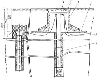 Рис. 13. Анодное заземление из чугунных труб 1 - электрод; 2 - люк; 3 - подушка под люк; 4 - гравий; 5 - кабель электрохимической защиты; 6 - глинистый раствор; 7 - битум