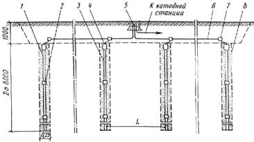 Рис. 14. Анодное заземление с вертикальным размещением железокремниевых электродов 1 - коксовая мелочь (ГОСТ 11255-65); 2 - изоляционное соединение встык; 3 - железокремниевый электрод; 4 - токоввод с кабельным выводом; 5 - контактное устройство; 6 - кабельная магистраль; 7 ¸ фитинг ФГ-20; 8 - буровая скважина 5.2.12. Монтаж анодных заземлений из железокремниевых анодов рекомендуется осуществлять в соответствии с «Методическими рекомендациями по применению железокремниевых анодов для катодной защиты подземных металлических сооружений» (М., ОНТИ АК.Х, 1974). На рис. 14 показана конструкция анодного заземления из железокремниевых анодов с вертикальной установкой анодов. Для монтажа анодов бурят скважину глубиной до 10 м, диаметром до 0,25 м. В каждую скважину опускают до пяти электродов. Скважина заполняется коксовой мелочью или глинистым буровым раствором. Электрические выводы от вертикальных анодов с основной кабельной магистралью соединяют с помощью фитингов, которые устанавливают в предварительно вырытой траншее вдоль группы вертикальных анодов. Траншеи роют в 0,3-0,5 м от оси анодов. Глубина траншеи около 1 м, ширина 0,3-0,5 м. 5.2.13. Установку и монтаж анодных заземлений из углеграфитовых электродов рекомендуется производить по рабочим чертежам «Альбома А-388-77. Анодное заземление углеграфитовых электродов диаметром 114 мм» (Л., Ленгипроинжпроект, 1977). 5.2.14. По окончании монтажа контура анодного заземления измеряют величину сопротивления растеканию, которая не должна превышать значения, указанного в проекте. 5.2.15. Исполнительные чертежи на построенные электрозащитные установки составляют строительные организации в процессе производства строительных работ. 5.2.16. Представители эксплуатационных и проектных организаций, осуществляющие технический и авторский надзор, обязаны: контролировать выполняемые работы в процессе строительства, делать соответствующие записи в журналах авторского и технического надзора и после завершения работ подписывать акт на строительно-монтажные работы (ф. 3-1 прил. 2); при обнаружении серьезных отступлений от проекта или низком качестве строительно-монтажных работ официальным предписанием остановить работы и о выявленных дефектах составить акт (в 3 экз.). Один экземпляр акта направить в междуведомственную комиссию в день его составления. 5.2.17. Строительно-монтажная организация, получив предписание, обязана в намеченный срок исправить допущенные дефекты, после чего вызвать представителя заинтересованных организаций для повторной приемки объекта. 5.2.18. После окончания строительства и монтажа электрозащитных установок подрядная организация передает заказчику один экземпляр проекта; исполнительные чертежи; оформленные акты на строительно-монтажные работы (на каждую установку в отдельности); справку городской электросети, разрешающую эксплуатацию установки. 5.2.19. Наладку установок электрозащиты производит строительная или эксплуатационная организация. В случае недостаточной эффективности работы электрозащитных устройств (зона действия меньше предусмотренной проектом, недостаточный защитный потенциал сооружения и т. д.) наладку устройств выполняют совместно с представителями проектной организации. 5.2.20. Налаживают и регулируют установку электрозащиты подбором оптимального режима ее работы с одновременным