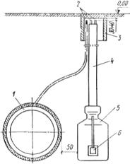 Рис. 15. Устройство контрольно-измерительного пункта с электродом МЭСД-АКХ 1 - трубопровод; 2 - контрольные проводники; 3 - ковер; 4 - предохранительная трубка; 5 - электрод сравнения; 6 - датчик электрохимического потенциала При установке электродов в глинистых или суглинистых грунтах специальной подготовки грунта не требуется, В сухих песчаных или супесчаных грунтах электрод устанавливают на специальную подушку из глины толщиной 100 мм, корпус электрода полностью засыпают просеянным грунтом, заливают 3-4 ведрами воды и осторожно утрамбовывают. Перед установкой электрода в рабочее положение через предохранительную трубку протягивают соединительные проводники; на штекеры насаживают пробку, которую вставляют в трубку. Верхний конец предохранительной трубки устанавливают ниже крышки ковера контрольно-измерительного пункта на 100 мм, нижний - вводят в горловину корпуса электрода, предварительно залитую битумом. 5.5.4. Проверку и приемку контрольно-измерительного пункта производят после засыпки траншеи. При приемке представляют: схему трассы трубопровода (только в случаях установки контрольно-измерительного пункта на вновь строящихся трубопроводах); эскизы с точными привязками на местности установленных контрольно-измерительных пунктов (если таковые не могут быть даны на схеме). По окончании приемки представителю строительной организации выдают справку (ф. 3-5 прил. 2). 5.5.5. Проверку исправности контрольно-измерительного пункта, оборудованного медно-сульфатным электродом сравнения с датчиком электрохимического потенциала (МЭСД-АКХ), осуществляют измерением сопротивления между выводами: электрод сравнения - датчик и электрод сравнения - трубопровод. Измерения производят с помощью мегомметров типа М-4100 (модификации М-4100/1, М-4100/2 или М-4100/3). Контрольно-измерительный пункт считается исправным, если величины сопротивлений между указанными выводами контрольно-измерительного пункта находятся в диапазоне 0,1-10 кОм. ГЛАВА 5.6. МОНТАЖ ЭЛЕМЕНТОВ СОВМЕСТНОЙ ЗАЩИТЫ5.6.1. Места включений электрических перемычек при осуществлении совместной защиты намечаются в проекте и уточняются при наладке. 5.6.2. Монтаж элементов совместной защиты включает: рытье траншеи для прокладки перемычек между совместно защищаемыми подземными сооружениями; прокладку и подключение перемычек к защищаемым подземным сооружениям; включение в перемычки предохранителей, сопротивлении и вентильных элементов (при необходимости). 5.6.3. Электроперемычки к трубопроводу присоединяют термитной сваркой или электросваркой. Площадь сварного шва должна быть не менее 500 мм2. Стальную полосу и места присоединения ее к трубопроводу изолируют битумным покрытием толщиной не менее 9 мм или другими равноценными материалами. 5.6.4. Подключение перемычек между кабелем связи и совместно защищаемым трубопроводом должно выполняться в местах расположения соединительных муфт на кабелях связи. ЧАСТЬ VI. ЭКСПЛУАТАЦИЯ УСТАНОВОК ЭЛЕКТРОХИМИЧЕСКОЙ ЗАЩИТЫГЛАВА 6.1. ПОРЯДОК ПРИЕМКИ И ВВОДА В ЭКСПЛУАТАЦИЮ УСТАНОВОК ЭЛЕКТРОХИМИЧЕСКОЙ ЗАЩИТЫ6.1.1. Установки электрохимической защиты вводят в эксплуатацию после завершения пусконаладочных работ и испытания на стабильность в течение 72 ч. 6.1.2. Электрозащитные установки принимает в эксплуатацию комиссия, в состав которой входят представители следующих 