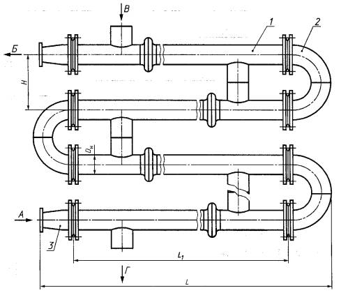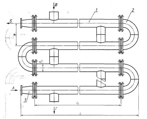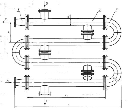 1 - переход исполнения 1 (см. рисунок 11); 2 - блок-секция типа ПВ1; 3 - калач соединительный исполнения 1 (см. рисунок 10); А - вход нагреваемой воды; Б - выход нагреваемой воды; В - вход греющей воды, Г - выход греющей воды