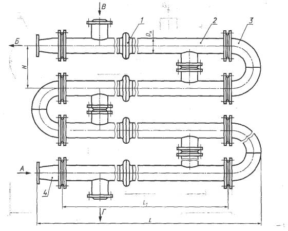 1 - компенсатор теплового расширения; 2 - секция типа ПВ1К; 3 - соединительный калач исполнения 1 (см. рисунок 10); 4 - переход исполнения 1 (см. рисунок 11); А - вход нагреваемой воды, Б - выход нагреваемой воды; В - вход греющей воды, Г- выход греющей воды Рисунок 2 - Подогреватель из четырех блоков-секций типа ПВ1К с типовым расположением патрубков и компенсатором на корпусе