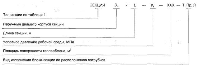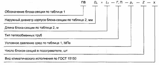 3.3 В условное обозначение подогревателя из блоков-секций с поверхностью теплообмена из гладких труб следует вводить букву «Г», с поверхностью теплообмена из профильных труб - букву «П». 3.4 Структурная схема условного обозначения подогревателя