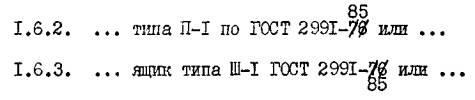 Лист 16 Таблица 1.2. 1. Вычеркнуть из графы "Вид климатического исполнения" - У3 эксп.исп. (6 раз) и из графы "Код ОКП" соответствующие коды ОКП (6 раз). 2. Вычеркнуть из графы "Вид климатического исполнения" слова "эксп.исп." после Т2 и Т3. Пример: Т2 Т3 Лист 18 Таблица 2.2. 1. Вычеркнуть из графы "Вид климатического исполнения" - У3 эксп.исп. (7 раз) и из графы "Код ОКП" соответствующие коды СКП (7 раз). 2. Вычеркнуть из графы "Вид климатического исполнения" слова "эксп.исп." после Т2 и Т3. Пример: Т2 Т3 Лист 19 Продолжение табл.2.2. 1. Вычеркнуть из графы "Вид климатического исполнения" - У3 эксп.исп. (6 раз) и из графы "Код ОКП" соответствующие коды ОКП (6 раз). 2. Вычеркнуть из графы "Вид климатического исполнения" слова "эксп.исп." после Т2 и Т3. Пример: Т2 Т3 Лист 20 Продолжение табл.2.2. I. Вычеркнуть из графы "Вид климатического исполнения" - У3 эксп.исп. (2 раза) и из графы "Код ОКП" соответствующие коды СКП (2 раза). 2.. Вычеркнуть из графы "Вид климатического исполнения" слово "эксп." после Т2 и Т3. Пример: Т2 Т3 Лист 22 Таблица 3.2 1. Вычеркнуть из графы "Вид климатического исполнения" - У3 эксп.исп. (4 раза) и из графы "Код ОКП" соответствующие коды ОКП (4 раза). 2. Вычеркнуть из графы "Вид климатического исполнения" слово "эксп" после Т2 и Т3. Пример: Т2 Т3 Листы: 13, 23, 24, 25 без изменения аннулировать и заменить листами 13, 23, 24, 25 изм."2". Примечание: В замененных листах учтены требования вновь выпущенных и замененных стандартов. 4. ТРАНСПОРТИРОВАНИЕ И ХРАНЕНИЕ 4.1. Заглушки транспортируются всеми видами транспорта в крытых транспортных средствах. Допускается формирование грузовых мест в транспортные пакеты (поддоны плоские упрощенные, поддоны ящичные универсальные - решетчатые, сетчатые) по ГОСТ 21929-76, размеры пакетов должны соответствовать ГОСТ 24597-81. 4.2. Транспортирование заглушек должно соответствовать следующим правилам: "Правила перевозки грузов автомобильным транспортом", утвержденные Министерством автомобильного транспорта РСФСР, изд. 1979г.; "Правила перевозки грузов" МПС, часть I, изд.1977г.; "Правила перевозки грузов" Минречфлота РСФСР, изд. 1979г.; "Правила безопасности морской перевозки генеральных грузов" Минморфлота. 4.3. Транспортирование в части воздействия климатических факторов для заглушек в тропическом исполнении - по условию 6, для умеренного климата - по условию 4, для морских перевозок в трюмах - по условию 3 ГОСТ 15150-69. 4.4. Хранение изделий в упаковке, соответствующей настоящим техническим условиям, должно соответствовать условию 6 - для тропического климата и условию 4 - для умеренного климата ГОСТ 15150-69. ПРИЛОЖЕНИЕ 4 ПЕРЕЧЕНЬ ГОСТ 6.37-79 УСД. Система документации по внешней торговле. Товаросопроводительная документация. ГОСТ 9.014-78 ЕСЗКС. Временная противокоррозионная защита изделий. Общие технические требования. ГОСТ 9.301-86 ЕСЗКС. Покрытия металлические и неметаллические неорганические. Общие требования. ГОСТ 9.302-79 ЕСЗКС. Покрытия металлические и неметаллические неорганические. Правила приемки и методы контроля. ГОСТ 356-80 Арматура и детали трубопроводов. Давления условные пробные и рабочие. Ряды. ГОСТ 2789-73 Шероховатость поверхности, параметры и характеристики. ГОСТ 2991-85 Ящики дощатые неразборные для грузов массой до 500 кг. Общие технические условия. ГОСТ 6111-52 Резьба коническая с углом профиля 60°. ГОСТ 6357-81 Основные нормы взаимозаменяемости. Резьба трубная цилиндрическая. ГОСТ 9378-75 Образцы шерохов