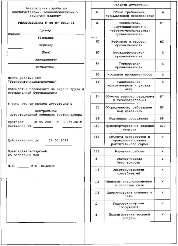 Результаты рассмотрения: допускается (не допускается) к аттестации в Центральной (Межрегиональной, территориальной) аттестационной комиссии Федеральной службы по экологическому, технологическому и атомному надзору в следующих областях аттестации:________________________________________________________