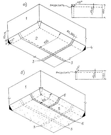 повышенным расположением верхней части парапетных панелей (более 3.2.6. Раскладка и раскрой полотнищ наплавляемого рулонного материала при устройстве основного и дополнительного кровельного ковра в углу парапета приведены на рис. 5 и 6. 3.2.7. Конек кровли (при уклоне 3 % и более) усиливают на ширину 150...250 мм с каждой стороны, а ендову - на ширину 500...700 мм (от линии перегиба) одним слоем рулонного материала, приклеиваемого к основанию под кровельный ковер по продольным кромкам (рис. 7 и 8). 3.2.8. Места пропуска через кровлю труб выполняют с применением стальных патрубков с фланцами (или железобетонных стаканов) и герметизацией кровли в этом месте (рис. 9). Места пропуска анкеров также усиливают герметизирующей мастикой. Для этого устанавливают рамку из уголков (которая ограничивает растекание мастики), а пространство между рамкой и патрубком или анкером заполняют мастикой (рис. 10).