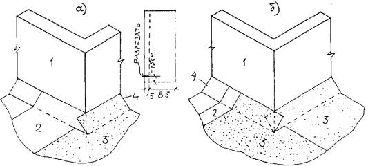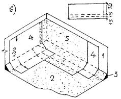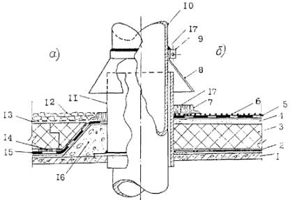 12 - оцинкованная кровельная сталь; 13 - костыли 40×4 мм через Рис. 5. Раскладка и раскрой полотнищ наплавляемого рулонного материала (а - нижнего слоя; б - верхнего слоя) при устройстве основного кровельного ковра в углу парапета 1 - парапет; 2 - нижний слой ковра; 3 - нахлестка полотнищ нижнего слоя; 4 - наклонный переходный бортик; 5 - верхний слой ковра (с крупнозернистой посыпкой); 6 - нахлестка полотнищ верхнего слоя. Рис. 6. Раскладка и раскрой полотнищ наплавляемого рулонного материала при устройстве дополнительного кровельного ковра в углу парапета 1 - парапет; 2 - основной кровельный ковер; 3 - переходный наклонный бортик; 4 - нижний слой дополнительного ковра; 5 - верхний слой (с крупнозернистой посыпкой) дополнительного ковра. Рис. 7. Конек кровли а) традиционного, б) инверсионного покрытия; 1 - железобетонная плита покрытия; 2 - пароизоляция; 3 - теплоизоляция; 4 - цементно-песчаная стяжка; 5 - основной кровельный ковер; 6 - крупнозернистая посыпка верхнего слоя наплавляемого рулонного материала; 7 - дополнительный слой кровли; 8 - бетон; 9 - грунтовка; 10 - предохранительный (фильтрующий) слой; 11 - пригруз из гравия. Рис. 8. Ендова кровли а) традиционного, б) инверсионного покрытий; 1 - железобетонная плита; 2 - пароизоляция; 3 - теплоизоляция; 4 - цементно-песчаная стяжка; 5 - дополнительный слой кровли, приклеенный по продольным кромкам; 6 - основной кровельный ковер; 7 - крупнозернистая посыпка верхнего слоя наплавляемого рулонного материала; 8 - воронка внутреннего водостока; 9 - грунтовка; 10 - легкий бетон; 11 - предохранительный (фильтрующий) слой; 12 - пригруз из гравия. Рис. 9. Примыкание кровли к трубе а) в инверсионном покрытии, б) в покрытии с кровлей по утеплителю; 1 - сборная железобетонная плита покрытия; 2 - пароизоляция; 3 - теплоизоляция; 4 - выравнивающая стяжка; 5 - основной кровельный ковер; 6 - крупнозернистая посыпка; 7 - рамка из уголка; 8 - зонт; 9 - хомут; 10 - труба; 11 - патрубок с фланцем; 12 - пригруз из гравия; 13 - предохранительный (фильтрующий) слой из синтетического холста; 14 - точечная приклейка теплоизоляции; 15 - основной кровельный ковер; 16 - легкий бетон; 17 - герметизирующая мастика. Рис. 10. Пропуск анкера через кровельный ковер 1 - сборная железобетонная плита покрытия; 2 - пароизоляция (по расчету), 3 - теплоизоляция; 4 - выравнивающая стяжка; 5 - основной кровельный ковер; 6 - крупнозернистая посыпка верхнего слоя наплавляемого рулонного материала; 7 - рамка из уголка; 8 - герметизирующая мастика; 9 - анкер 3.2.9. В деформационном шве с металлическим компенсатором перед устройством кровельного ковра на компенсатор наклеивают сжимаемый утеплитель из минеральной ваты и на него укладывают выкружку из оцинкованной кровельной стали, кромки которой опираются на бетонные бортики, затем на выкружку насухо укладывают стеклоткань и наплавляемый рулонный материал (рис. 11). 3.2.10. Раскладка и раскрой полотнищ наплавляемого рулонного материала при устройстве основного и дополнительного кровельного ковра на поверхности внешнего угла (например, вентшахты) приведены на рис 11. 3.2.11. В местах пропуска через покрытие воронки внутреннего водостока слои кровельного ковра должны заходить на водоприемную чашу, которую крепят к плитам покрытия хомутом с уплотнителем из резины (рис. 13). 3.2.12. Технологические приемы устройства кровельного ковра методом свободной укладки нижнего слоя с механиче