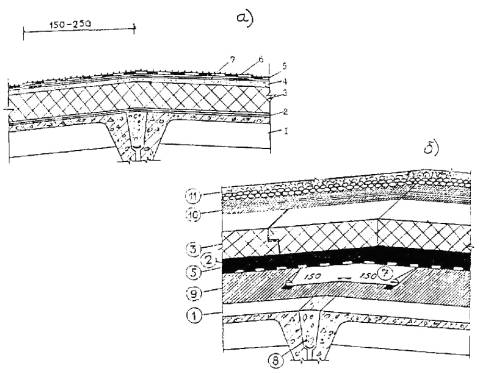 - пригруз из гравия; 6 - дополнительные два слоя из наплавляемого рулонного материала