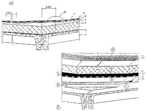 б) инверсионного покрытий; 1 - сборная железобетонная плита покрытия; 2 -