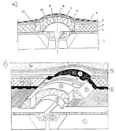 обеспечивают нахлестку (продольную и поперечную) не менее Затем полотнище рулонного материала (кроме полотнища, раскатанного вдоль линии водораздела) обратно скатывают в рулоны (при значительном охлаждении полотнищ зимой эти операции производят при легком подогреве ручной горелкой поверхности рулона). Рис. 11. Деформационный шов в покрытии а) традиционном, б) инверсионном; 1 - сборная железобетонная плита покрытия; 2 - пароизоляция; 3 - теплоизоляция, 4 - выравнивающая стяжка, 5 - основной кровельный ковер; 6 - рулонный материал, уложенный насухо; 7 - стеклоткань; 8 -оцинкованная кровельная сталь; 9 - компенсатор, 10 - утеплитель (минеральная вата), 11 - бортик из легкого бетона; 12 - грунтовка; 13 - предохранительный (фильтрующий) слой; 14 - пригруз из гравия.
