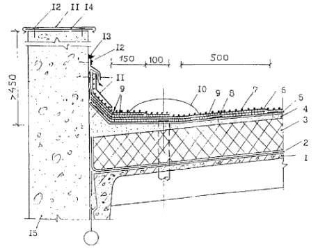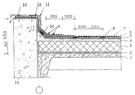 железобетонная плита покрытия; 2 - основной кровельный ковер из наплавляемых