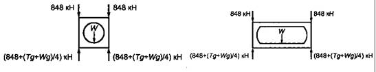 где R - максимальная масса брутто контейнера; Т - масса порожнего контейнера. W обозначает полезную нагрузку контейнера при полностью заполненной водой цистерне. Примечание - R, Р, Т и W в соответствии с определением измеряют в единицах массы. В случае, когда требования к испытаниям основываются на гравитационных силах, эти силы являются инерционными и обозначаются как Rg, Pg, Tg, Wg и измеряются в ньютонах или единицах, производных от ньютона. Слово «нагрузка», когда его используют при описании физического количества единиц, означает «массу». Слово «усилие», например в словосочетании «внутреннее усилие», означает воздействующую силу. 6.1.2 Испытуемый контейнер-цистерна, если не предусмотрено иное, должен быть загружен подходящим жидким/сухим сыпучим грузом для достижения указанной испытательной нагрузки или усилия. Если испытательная нагрузка или усилие могут быть получены вышеупомянутым методом или, если такой метод нежелателен, контейнер-цистерна должен быть загружен подходящим жидким/сухим сыпучим грузом и к нему должна быть приложена дополнительная нагрузка или усилие. Приложенная общая нагрузка или усилие должно быть равномерно распределено. Отклонения в 20 % диаграмм расчетного изгибающего момента равномерно загруженного контейнера-цистерны должны приниматься как допустимые. Примечание - Могут применяться другие альтернативные методы приложения испытательных нагрузок или усилий (например при испытаниях на продольное и поперечное крепления) при условии, что они обеспечивают достижение требуемых усилий. 6.1.3 Испытательные нагрузки и усилия, указанные для всех перечисленных испытаний, являются минимальными. Примечание - Особое внимание следует обратить на усилия, возникающие при эксплуатации контейнеров-цистерн типов В5 и В6. 6.1.4 Контейнер-цистерна должен находиться под действием испытательных нагрузок в течение 5 мин, если иное не оговорено. 6.1.5 Требования к размерам, на которые делаются ссылки в требованиях по испытаниям, указаны в: - требованиях к конструкции и размерам в разделах 4 и 5 настоящего стандарта; - [3]. 6.2 Испытание № 1. Штабелирование6.2.1 Общие положения Испытание проводится с целью проверки способности контейнера-цистерны выдерживать массу контейнеров, поставленных сверху, учитывая условия, возникающие на борту судна в море, и относительное смещение между поставленными друг на друга контейнерами. В таблице 2 указаны силы, которые необходимо приложить в ходе испытания к каждой паре угловых фитингов, и помещенные сверху массы, создающие компенсирующее испытательное усилие. 6.2.2 Методика проведения испытания Контейнер-цистерну, полностью заполненный водой, помещают на четыре равные опоры, расположенные на одном уровне, по одной под каждым нижним угловым фитингом. Центры опор и фитингов, а также их размеры в плане должны совпадать. Контейнер-цистерна должен быть подвергнут воздействию вертикальных сил, указанных в таблице 2, приложенных или ко всем четырем угловым фитингам одновременно, или к каждой паре торцевых фитингов. Силы должны быть приложены через специальное испытательное приспособление, снабженное угловыми фитингами, соответствующими ГОСТ 20527-82 или аналогичными фитингам элементами, имеющими оттиск той же геометрии (т.е. таких же внешних размеров, с отверстиями, со снятой фаской и закругленным