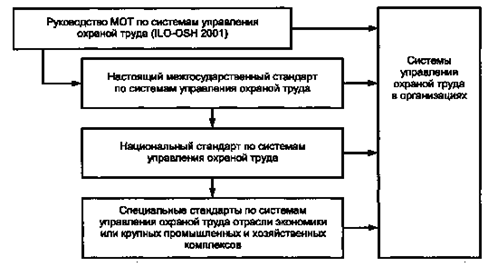 Дата введения - 2009-07-01 1. Область примененияЦелью настоящего стандарта является содействие защите работников от воздействия опасных и вредных производственных факторов, исключению несчастных случаев, в том числе со смертельным исходом, и профессиональных заболеваний на производстве. На национальном уровне стандарт служит: a) для установления национальных основ системы управления охраной труда, подкрепленных национальными законами и иными нормативными правовыми актами; b) руководящими указаниями по применению добровольных мероприятий по охране туда в организациях, направленных на соблюдение норм и иных нормативных правовых актов, ведущих к непрерывному совершенствованию деятельности в области охраны труда; c) руководящими указаниями для развития национальных и специальных корпоративных стандартов по системам управления охраной труда для качественного обеспечения практических потребностей организаций в соответствии с их размером и характером деятельности. На уровне организации стандарт предназначен: a) служить руководящими указаниями по объединению элементов системы управления охраной труда в организации в качестве составной части общей политики и системы управления; b) способствовать активизации всех работников организации, в том числе работодателей, собственников, управленческого персонала, работников и их представителей с целью применения современных принципов и методов управления охраной труда, направленных на непрерывное совершенствование деятельности по охране труда. 2. Термины и определенияВ настоящем стандарте применены следующие термины с соответствующими определениями: 2.1. инцидент (incident): Небезопасное происшествие, связанное с работой или произошедшее в процессе работы, но не повлекшее за собой несчастного случая. 2.2. комитет (комиссия) по охране труда (safety and health committee): Комитет, в состав которого входят представители работников и представители работодателей, созданный и функционирующий на уровне организации согласно национальным законам, правилам и практике. 2.3. компетентное лицо (competent person): Лицо, обладающее необходимой подготовкой и достаточными знаниями, умениями и опытом для выполнения конкретной работы. 2.4. компетентное учреждение (competent institution): Государственный орган или другая организация, обладающая полномочиями по определению национальной политики, разработке национальных основ систем управления охраной труда в организациях и формулированию соответствующих стандартов. 2.5. наблюдение за производственной средой (surveillance of the working environment): Определение и оценка факторов производственной среды и трудового процесса, которые могут оказывать воздействие на здоровье работников. Примечание - Этот процесс охватывает оценку санитарно-гигиенических условий труда, организации труда и социально-психологических факторов на рабочем месте, которые могут представлять риск для здоровья работников, воздействия на работников опасных и вредных производственных факторов и системы защиты от них, разработанные для их устранения и снижения. 2.6. наблюдение за состоянием здоровья работников (workers'health surveillance): Процедуры и обследования состояния здоровья работников для обнаружения и определения отклонений от нормы. Примечание - Результаты наблюдения за состоянием здоровья работников должны использов