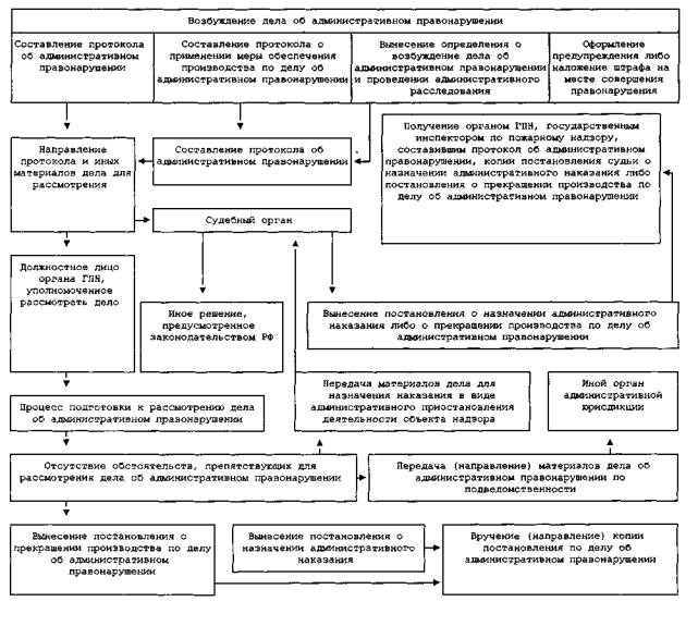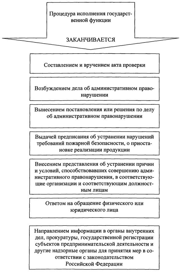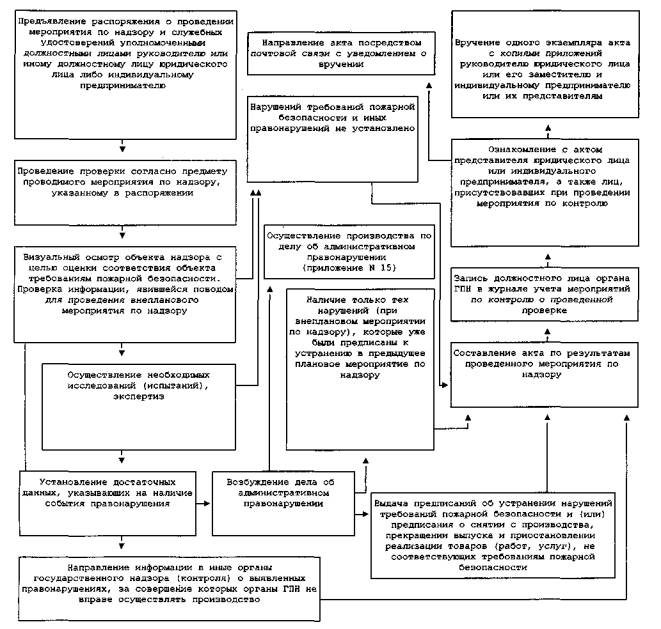 Продолжительность перерыва рабочего дня для отдыха и питания (приема пищи) устанавливается в соответствии с законодательством Российской Федерации. 17. Органы ГПН осуществляют прием граждан не реже двух раз в неделю из расчета 4 часа в день. График приема утверждается решением начальника органа ГПН и размещается на доске объявлений в органе ГПН в доступном для граждан месте. 18. Перечень государственных инспекторов по пожарному надзору и предоставленных им прав по рассмотрению дел об административных правонарушениях приведен в приложении N 3 к Административному регламенту. III. Административные процедуры19. Исполнение государственной функции включает в себя следующие административные процедуры: планирование мероприятий по надзору в органах ГПН; проведение плановых мероприятий по надзору за соблюдением лицами, указанными в п. 6 настоящего Административного регламента, требований пожарной безопасности; проведение внеплановых мероприятий по надзору за соблюдением лицами, указанными в п. 6 настоящего Административного регламента, требований пожарной безопасности; снятие с производства, прекращение выпуска и приостановление реализации товаров (работ, услуг), не соответствующих требованиям пожарной безопасности; проведение мероприятий по надзору, осуществляемых по инициативе физических и юридических лиц; оформление результатов и принятие мер по результатам мероприятий по надзору; регистрация и учет мероприятий по надзору; проведение консультаций по исполнению государственной функции и иным вопросам, входящим в компетенцию органов ГПН; рассмотрение жалоб на действия (бездействия) и решения должностных лиц органов ГПН. Приказом МЧС РФ от 14 ноября 2008 г. N 688 в пункт 20 настоящего Регламента внесены изменения 20. Выполнение административных процедур исполнения государственной функции может быть закончено (приложение N 4) составлением и вручением акта проверки соблюдения требований пожарной безопасности (далее - акт проверки) (приложение N 5), а также процедурой или совокупностью следующих процедур: абзац исключен; возбуждением дела об административном правонарушении; вынесением постановления или решения по делу об административном правонарушении; выдачей предписаний по устранению нарушений требований пожарной безопасности (далее - предписания по устранению нарушений) (приложение N 6); выдачей предписания по снятию с производства, прекращению выпуска и приостановлению реализации товаров (работ, услуг), не соответствующих требованиям пожарной безопасности (далее - предписание по снятию с производства) (приложение N 7); внесением представлений об устранении причин и условий, способствовавших совершению административного правонарушения, в соответствующие организации и соответствующим должностным лицам; подготовкой и направлением ответа по результатам рассмотренного обращения физического или юридического лица; подготовкой и направлением при необходимости информации в органы внутренних дел, прокуратуры, государственной регистрации субъектов предпринимательской деятельности и другие надзорные органы для принятия мер в соответствии с законодательством Российской Федерации. Последовательность административных действий (процедур) по проведению плановых и внеплановых мероприятий по надзору за соблюдением треб
