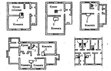 Примечание. Этажность зданий следует принимать без учета цокольного этажа. 2.1.2 Запрещается печное отопление в зданиях категорий А, Б и В (в соответствии с категорированием зданий по НПБ 105-03). 2.1.3 Поквартирные печи на твердом топливе допускается предусматривать в жилых зданиях до двух этажей включительно. 2.1.4 Печное отопление допускается для одноквартирных индивидуальных жилых домов и коттеджей. 2.1.5 При размещении печей в помещениях следует учитывать расположение дымовых каналов и планировочные решения здания. Варианты размещения печей приведены на рис. 2.1.