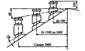 Рис. 2.2. Варианты размещения дымовых каналов над кровлей 2.2.14. Возвышение дымовых труб на 500 мм необходимо предусматривать: - выше верхней точки здания, пристроенного к отапливаемому; - выше верхней плоскости ветровой тени более высокого рядом стоящего здания или сооружения. 2.2.15 Устройство зонтов, дефлекторов и других насадок на дымовых трубах не допускается. 2.2.16 Установка дымовых каналов из сборных металлических труб должна отвечать следующим требованиям: - коррозийная стойкость (относительного воздействия топочных газов) металлических труб должна быть не ниже чем стойкость, соответствующая скорости коррозии, равной 0,01 мм/год; - стенки внутренней поверхности дымовых труб должны быть гладкими, без выступов; - конструкция дымовых каналов должна обеспечивать удобство чистки (через верх или прочистные люки) и осмотра, а также требуемую тягу (разрежение в дымовом канале должно быть не ниже указанного в Руководстве по эксплуатации печи); - крепления дымовых труб должны быть надежными и долговечными, необходимо закрепить как минимум половину фрагментов (т.е. через один); - должны быть обеспечены герметичность, надежность и прочность сочленений фрагментов дымовых каналов, исключающих просачивание продуктов сгорания. 2.3. Кладка (монтаж) печей и их дымовых каналов2.3.1 В пределах чердачного помещения наружные поверхности дымовой трубы следует оштукатурить и побелить. 2.3.2 При устройстве печей повышенного прогрева следует защитить печь с наружной стороны металлическим футляром или каркасом, который крепится кляммерами из полосок кровельной стали длиной 100 мм и шириной 10-15 мм, приклепанных к стенке футляра и зажимающихся в швах кирпичной кладки. В качестве каркаса могут использоваться асбоцементные листы, которые снаружи окрашиваются составом, содержащим 70 % асфальтового лака № 177, 20 % алюминиевой пудры и 10 % бензина. 2.3.3 Строительные конструкции, выполненные из сгораемых материалов и примыкающие к печам и дымовым каналам должны защищаться от возгорания путем устройства отступок или разделок с защитой конструкций несгораемой теплоизоляцией. 2.3.4 Отступка может выполняться: закрытой полностью, с двух сторон, с одной стороны и открытой со всех сторон. 2.3.5 Размеры отступок и способы защиты сгораемых стен и перегородок в зависимости от вида отступки и конструктивных особенностей печи следует принимать согласно табл. 2.2. Таблица 2.2