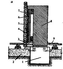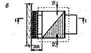 б - вид сверху. Рис. 2.3. Устройство закрытой отступки: 1 - фундамент печи; 2 - уплотнительный слой; 3 - несгораемый пол; 4 - деревянная стена; 5 - щит из досок; 6 - теплоизоляция (асбест или войлок); 7 - кирпич «на ребро»; 8 - печь; 9 - предтопочный лист; 2.3.7 Для циркуляции воздуха в закрытой отступке в стенах с боковых сторон выполняются отверстия над полом и вверху и устанавливаются решетки. 2.3.8 Пол в отступке следует выполнять из негорючих материалов на 70 мм выше уровня пола помещения. Допускается сгораемый пол с обеспечением его защиты в отступке с пределом огнестойкости не менее 0,75 ч. 2.3.9 Для отопительных печей длительного горения и каркасных печей со стенками толщиной 65 мм отступки следует выполнять открытыми со всех сторон. 2.3.10 Изоляция сгораемых конструкций в открытых отступках должна осуществляться штукатуркой толщиной 25 мм или кровельной сталью по асбестовому картону толщиной 8 мм и выходить за контуры печи на 150 мм. 2.3.11 Потолки, выполненные из сгораемых материалов, над перекрытием печи должны защищаться от возгорания. 2.3.12 Расстояние между верхом перекрытия печи, выполненного из трех рядов кирпича, и потолком из горючих материалов, защищенным штукатуркой по стальной сетке или стальным листом по асбестовому картону толщиной 10 мм, следует принимать 250 мм для печей с периодической топкой и 700 мм для печей длительного горения, а при незащищенном потолке соответственно 350 и 1000 мм. Для печей, имеющих перекрытие из двух рядов кирпича, указанные расстояния следует увеличивать в 1,5 раза. Расстояние между верхом металлической печи с теплоизолированным перекрытием и защищенным потолком следует принимать 800 мм, а для печи с нетеплоизолированным перекрытием и незащищенным потолком - 1200 мм. 2.3.13 Пространство между перекрытием (перекрышей) теплоемкой печи и потолком из горючих материалов допускается закрывать со всех сторон кирпичными стенками. Толщину перекрытия печи при этом следует увеличивать до четырех рядов кирпичной кладки, а расстояние от потолка принимать в соответствии с п. 2.3.12. В стенах закрытого пространства над печью следует предусматривать два отверстия на разном уровне с решетками, имеющими площадь живого сечения каждая не менее 150 см2. 2.3.14 Расстояние от наружных поверхностей кирпичных или бетонных дымовых труб до стропил, обрешеток и других деталей кровли из горючих материалов следует предусматривать в свету не менее 130 мм, от керамических труб без изоляции - 250 мм, а при теплоизоляции с сопротивлением теплопередаче 0,3 м2·К/Вт негорючими или трудногорючими материалами - 130 мм. Пространство между дымовыми трубами и конструкциями кровли из негорючих и трудногорючих материалов следует перекрывать негорючими кровельными материалами. 2.3.16 Устройство вертикальной разделки при расположении отопительных печей в проемах сгораемых конструкций приведено на рис. 2.4. 2.3.17. Вертикальные разделки следует выполнять на всю высоту печи в пределах помещения толщиной не менее толщины примыкающей стены или перегородки.