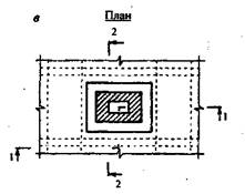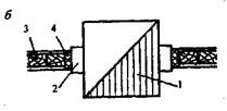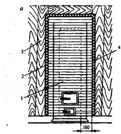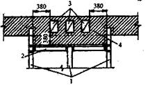 б - вид сверху Рис. 2.4. Устройство вертикальной разделки: 1 - печь; 2 - вертикальная разделка; 3 - сгораемая конструкция; 4 - тепло- -изоляция; 2.3.18 Перевязка вертикальных разделок с кладкой печи или дымового канала не допускается, так как это может вызвать образование трещин при осадке печи. 2.3.19 Защита сгораемых конструкций в пределах разделки может выполняться асбестовым картоном толщиной 8 мм или войлоком толщиной 20 мм, смоченным в глиняном растворе. 2.3.20 При устройстве двухъярусных печей следует выполнять горизонтальные разделки в местах пересечения печами сгораемых конструкций перекрытия. 2.3.21 Горизонтальные разделки перевязываются с кладкой печи. Не допускается опирать разделку на перекрытие. Для независимой осадки здания и печи между разделкой и строительной конструкцией оставляется зазор 15 мм, который заполняется негорючими материалами (глиняный раствор с добавлением асбестовой крошки). 2.3.22 Высоту разделки следует принимать больше толщины перекрытия так, чтобы верх разделки выступал над полом или засыпкой на чердаке на 70 мм. 2.3.23 Укладка деревянных балок перекрытия в разделке между верхним и нижним ярусами двухъярусной печи не допускается. 2.3.24 Разделка от дна зольника и дымооборотов до сгораемого пола должна выполняться тремя рядами кирпича, обеспечивая расстояние не менее 210 мм. При несгораемой конструкции пола дно зольника и дымооборотов допускается выполнять на одном уровне с полом. 2.3.25 Стену или перегородку из горючих материалов, расположенную под углом к фронтону печи на расстоянии менее 1250 мм от топочной дверки, следует защищать от возгорания от пола до уровня на 250 мм выше от топочной дверки. Защита должна обеспечивать предел огнестойкости конструкции не менее 0,75 ч. 2.3.26 Для защиты пола из сгораемых материалов под топочной дверкой устанавливается металлический лист размером 500x700 мм, длинной стороной вдоль печи. 2.3.27 Пол из горючих материалов под каркасными печами, в том числе на ножках, следует защищать от возгорания листовой сталью по асбестовому картону толщиной 10 мм, при этом расстояние от низа печи до пола должно быть не менее 100 мм. 2.3.28 Печи следует устанавливать на расстоянии не менее 0,5 м от строительных конструкций из сгораемых материалов. 2.3.29 Печи из сборных бетонных блоков должны иметь компенсаторы, предохраняющие разрушение блоков и образование сквозных трещин при разогреве массива печи во время топки. 2.3.30 Конструкции стен и перекрытий, выполненные из горючих материалов и примыкающие к дымовым каналам, следует защищать от возгорания путем устройства разделок. Размеры разделок следует принимать по п. 2.3.15 настоящих правил. 2.3.31 При пересечении дымовыми каналами конструкции перекрытий из горючих материалов необходимо устраивать горизонтальные разделки (рис. 2.5).