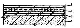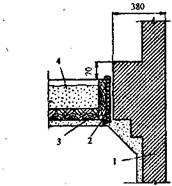 Рис. 3.2. Деталь пола: 1 - керамическая плитка; 2 - цементно-песчаная стяжка, толщиной 30 мм; 3 - древесно-волокнистые плиты; 4 - железобетонная плита перекрытия 3.4.2 Температура пола под камином не должна превышать 50 °С (п. 4.1.10 ГОСТ 9817-95) при его эксплуатации, для чего под его основание следует поместить слой теплоизоляционного негорючего материала соответствующей толщины (определяемой расчетом). 3.4.3 Пол из негорючих материалов под дверкой топки или портальным проемом каминов следует защищать от возгорания металлическим листом или другим негорючим материалом шириной не менее 500 мм. Длинная сторона листа должна быть не менее чем на 100 мм больше ширины дверки топки или портального проема камина. 3.4.4 При размещении каминов у стен (перегородок) из сгораемых материалов или примыкания к ним дымовых каналов необходимо на всем участке примыкания по высоте и ширине заменить горючий материал на негорючий (кирпич, ячеистый бетон и др.). Если такая замена невозможна, то для каминов и дымовых каналов, выполненных из кирпича, следует предусматривать устройство пожарных разделок из красного кирпича размером 380 мм с защитой конструкций от возгорания негорючим теплоизоляционным материалом. При использовании других негорючих матерка-лов для устройства разделок их термическое сопротивление с учетом толщины стенок каминов или дымовых каналов должно быть не менее 0,5 м·К/Вт. 3.4.5 При размещении каминов и дымовых каналов у строительных конструкций из горючих материалов следует предусматривать устройство отступок от наружных поверхностей каминов или каналов до стен или перегородок. Размер отступок и способ защиты конструкций от возгорания при кладке каминов и кирпичных дымовых каналов необходимо принимать по табл. 2.2. 3.4.6 При размещении сборных каминов у стен (перегородок) из сгораемых материалов следует предусматривать отступки от поверхностей каминов и дымовых труб по всей высоте строительных конструкций размером не менее 260 мм с защитой конструкций от возгорания несгораемым теплоизоляционным материалом. 3.4.7 В местах пересечения дымовыми каналами (трубами) междуэтажных и чердачных перекрытий из сгораемых материалов необходимо устраивать противопожарные разделки с учетом требований п. 3.4.4 настоящей главы (рис. 3.3). 3.4.8 Расстояние от наружных поверхностей кирпичных и бетонных каналов или металлических дымовых труб с теплоизоляцией с сопротивлением теплопередаче 0,3 м2·К/Вт до деталей кровли, выполненных из горючих материалов, следует принимать в свету не менее 130 мм, а от керамических труб без теплоизоляции - 250 мм. Пространство между дымовыми трубами и конструкциями кровли из сгораемых материалов необходимо перекрывать негорючими кровельными материалами.