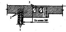 Рис. 2.6. Размещение деревянной балки в стене с дымовыми каналами: 1 - балка; 2 - теплоизоляция; 3 - дымовые каналы