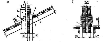 Рис. 2.7 Способ защиты ригеля от возгорания: 1 - балки; 2 -ригель; 3 - дымовые каналы; 4 - разделка 2.3.25 Расстояние от наружных поверхностей дымовых труб до металлических и железобетонных балок следует предусматривать не менее 130 мм. 2.3.36 Сгораемые конструкции кровли (стропила, обрешетки и т.д.) должны располагаться от наружной поверхности дымовой трубы на расстоянии не менее 130 мм. 2.3.37 Свободное пространство между дымовой трубой и конструкциями кровли следует перекрывать фартуком из кровельной стали, подведенным под выдру (рис. 2.8). 2.3.38 В зданиях с кровлями из горючих материалов на дымовых трубах от приборов на твердом топливе должны быть устроены искроуловители из металлической сетки с отверстиями не более 5×5 мм и не менее 3×3 мм во избежание отложений сажи.