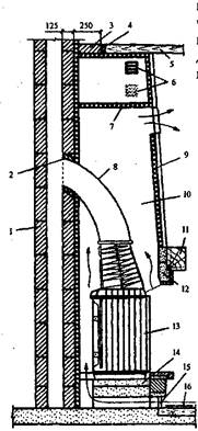 Рис. 3.1. Устройство камина с топкой закрытого типа: 1 - дымовой канал; 2 – уплотнительное устройство; 3- - противопожарная разделка; 4 - теплоизоляция для защиты конструкции от возгорания; 5 - деревянная конструкция; 6 - решетка; 7 - защитный экран; 8 - соединительный патрубок; 9 - теплоизоляция; 10 - защитный кожух; 11 - палка; 12 - пояс жесткости; 13 - топка камина; 14- основание; 15 - отверстие для поступления воздуха; 16- предтопочный лист 3.2.6. Облицовка топок и конвекционных (декоративных) кожухов должна выполняться из несгораемых материалов (кирпича, мрамора, природного камня и др.). При монтаже кожухов из листовых материалов вначале необходимо собрать жесткий каркас, уложить теплоизоляцию, а затем закрепить отделочные панели (гипсокартонные листы и т.п.). Каркас кожуха не должен опираться юлку камина (рис. 3.1). 3.2.7 Облицовочные детали могут соединяться между собой и с опорными стенами как механически, так и с применением растворов или мастик. В местах высоких температур следует использовать растворы на основе жаростойкого цемента или огнеупорные мастики. 3.2.8 Несущие стены и потолок в пределах ограждающего кожуха, а также внутренние стенки кожуха необходимо покрывать несгораемой теплоизоляцией толщиной не менее 30 мм (плиты базальтового волокна и др.). На теплоизоляционные материалы должен быть сертификат пожарной безопасности. 3.3. Проектирование и выбор дымовых каналов (труб) для каминов3.3.1 Для отвода продуктов горения следует использовать каналы в капитальных стенах, коренные или насадные трубы, опирающиеся на камин или междуэтажное перекрытие. 3.3.2 Коренные трубы должны устанавливаться на отдельные фундаменты (основания). Стеновые и коренные трубы следует выполнять из полнотелого красного керамического кирпича нормального обжига, без трещин, марки не ниже М125 или из жаростойких бетонных блоков. 3.3.3 Насадные дымовые трубы для каминов могут быть керамические или металлические с теплоизоляцией стенок несгораемым материалом. Толщина слоя теплоизоляционного материала принимается по проекту или определяется расчетом. Термическое сопротивление теплоизоляционного слоя (отношение толщины слоя материала в метрах к коэффициенту его теплопроводности) должно быть не менее 0,5 м2·К/Вт. 3.3.4 Металлические трубы должны быть из высококачественной специально легированной стали с повышенной коррозионной стойкостью, толщиной стенок не менее 1 мм. Конструкция стыков и отдельных звеньев труб должна обеспечивать герметичность в местах соединений и позволять компенсировать температурное расширение каждого элемента без деформации. Места стыков звеньев насадных труб необходимо размещать вне междуэтажных и чердачных перекрытий. 3.3.5 Сечение дымовых труб, выполненных из кирпича, следует принимать в зависимости от тепловой мощности каминов с учетом п. 2.2.9 настоящих правил. 3.3.6 Диаметры дымовых труб сборных каминов должны быть не менее диаметров выходных и соединительных патрубков. 3.3.7 Присоединение топок сборных каминов к дымовым каналам (трубам) нужно осуществлять при помощи патрубков из нержавеющей стали толщиной не менее 1 мм. Допускается применение патрубков из обычной стали толщиной не менее 2 мм или жаропрочных жестких и гибких труб, если они имеют сертификат, подтверждающий пригодность их для этой цели. В местах соединения деталей должна быть обесп