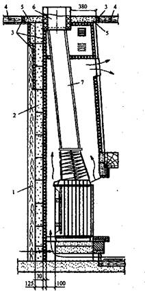 Рис. 3.3. Размещение камина у сгораемых конструкций: 1 - деревянная стена; 2 - кирпич (ячеистый бетон); 3 - теплоизоляционный несгораемый материал; 4 - перекрытие из сгораемых материалов; 5 - противопожарная разделка; 6 - дымовая труба; 7 - соединительный патрубок 3.4.9 При наличии кровли из горючих материалов дымовые каналы (трубы) следует оборудовать искроуловителями из металлической сетки с размерами ячеек не более 5×5 и не менее 3×3 мм во избежание отложений сажи. 3.4.10 Конструкции каминов и дымоходов должны обеспечивать свободный доступ для очистки топливника, дымового карниза и дымоходов от зольных и сажистых отложений. 3.4.11 С внешней стороны топки должна быть установлена барьерная решетка высотой не менее 0,1 м. 3.4.12 Стены, выполненные с применением горючих материалов, примыкающие под углом к фронтону камина, следует защищать от возгорания на высоту от пола до уровня на 0,25 м выше верха топочного отверстия. Защиту конструкций от возгорания тепловой изоляцией следует производить негорючими материалами с суммарным тепловым сопротивлением не менее 0,1 м2·К/Вт. Размеры защитной изоляции следует предусматривать больше высоты и ширины греющей поверхности на 0,15 м. 3.4.13 Суммарное тепловое сопротивление тепловой изоляции от внутренней поверхности дымовых каналов до металлических и железобетонных балок следует принимать не менее 0,15 м2·К/Вт. 3.4.14 При установке камина на перекрытие, выполненное с применением горючих материалов (класса K1, K2, К3), минимальное расстояние от уровня пола до дна зольника должно составлять 0,14 м. При отсутствии зольника расстояние от уровня пола до пола топливника должно быть не менее 0,21 м. 3.4.15 Перекрытие, выполненное с применением горючих материалов (класса K1, K2, К3), под каминами на металлических ножках необходимо изолировать негорючим материалом с тепловым сопротивлением не менее 0,08 м2·К/Вт с последующей обивкой кровельной сталью. Высота металлических ножек у каминов должна быть не менее 0,1 м. 3.5. Правила пожарной безопасности при эксплуатации каминов3.5.1 Перед розжигом каминов следует убедиться в наличии тяги в дымовых каналах (трубах). Для этого к приоткрытой дверке камина или к портальному проему необходимо поднести полоску тонкой бумаги. Отклонение ее в сторону топки свидетельствует о наличии тяги. 3.5.2 Загрузка топок дровами не должна превышать 2/3 объема топливника. 3.5.3 Необходимо своевременно очищать зольный короб. Переполненный короб может стать причиной возникновения обратной тяги с выходом продуктов горения в помещение. 3.5.4 В помещениях, в которых установлены камины, допускается хранение дров в количестве не более суточной потребности. Суточная потребность дров должна быть указана в пакете технической документации для каминов заводского изготовления или определена при пробной топке каминов, возводимых на месте установки (при их кладке). 3.5.5 Наружные поверхности кирпичных и керамических труб, проложенные на чердаках, должны быть побелены. 3.5.6 Очистка дымовых каналов (труб) от сажистых отложений должна осуществляться перед началом отопительного сезона, а также не реже одного раза в три месяца в течение отопительного сезона. 3.5.7 Помещения, в которых установлены камины, должны быть оснащены ручными порошковыми или углекислотными огнетушителями вместимостью не менее 2 л. 3.5.8 Дымовые каналы и камины необходимо