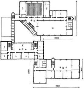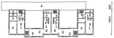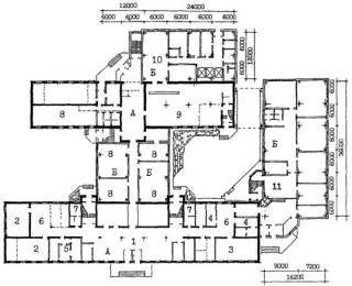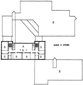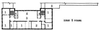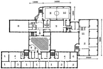 Рис. 23 Пример архитектурно-планировочного решения реконструкции здания школы типа 65-426.1 для школы на 33 класса 825 учащихся. План 3 этажа. А - существующее здание; Б - пристраиваемые объемы