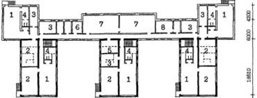 Примечания: 1. Площади помещений приняты с учетом сохранения планировочной и конструктивной структуры здания и пониженной высоты этажей в 2,8 м, требующей компенсации за счет увеличения площади помещений. 2. Переходный коэффициент отношения общей площади к расчетной принят 1,29 на основе показателей типового проекта 2МГ-04-3. 6. ПРИМЕРЫ АРХИТЕКТУРНО-ПЛАНИРОВОЧНЫХ РЕШЕНИЙ РЕКОНСТРУКЦИИ ЗДАНИЙ ШКОЛ И ДОШКОЛЬНЫХ УЧРЕЖДЕНИЙ ДЛЯ РАЙОНА ХОРОШЕВО-МНЕВНИКИ, КВАРТАЛ 81Примеры архитектурно-планировочных решений, представленные в данных Рекомендациях являются одним из возможных, вариантов реконструкции зданий школ и дошкольных учреждений и приведены в качестве иллюстративного материала к основным положениям Рекомендаций. Примеры решений демонстрируют объемы реконструкции существующих зданий, дополнительных пристроек к ним, а также возможности их размещения на существующих участках. Решения выполнены в соответствии с положениями данных Рекомендаций и действующими нормами и правилами, на основе ориентировочных составов и площадей помещений (табл. 7, 8 и 9), с учетом рекомендуемых типологических схем перепланировки и использования существующих зданий реконструируемых школ и дошкольных учреждений (рис. 4 - 9). Во всех вариантах предусмотрена возможность автономного использования клубно-спортивных помещений. 6.1. Реконструкция здания школы типа МЮ для размещения полной средней школы на 33 класса с наполняемостью класса в 30 учащихся - 990 мест (рис. 11, 16 - 19).6.1.1. В существующем 5-ти этажном здании школы размещаются учебные кабинеты и лаборатории 5 - 11 классов с перепланировкой основных помещений. На первом этаже размещены вестибюль, административные помещения и часть мастерских. 6.1.2. В существующем зальном блоке-пристройке предусматриваются мастерские, в новом 3-х этажном блоке-пристройке с габаритами 1870´46.2 м размещаются классы начальной школы. Связь блоков осуществляется по первому этажу. 6.1.3. Новый клубно-спортивный блок-пристройка с габаритами 33.0´54.0 м объединяется с учебным блоком остекленной галереей и рекреацией по первому этажу. На 1-ом этаже размещены столовая библиотека, клубные помещения. На 2-ом этаже - двухсветные актовый и спортивный залы. 6.2. Реконструкция здания школы типа МЮ для размещения полной средней школы на 33 класса с наполняемостью классов в 25 учащихся - 825 мест (рис. 11 - 15).6.2.1. В существующем 5-ти этажном корпусе школы полностью размещаются все учебные помещения 5-11 классов с минимальной перепланировкой по этажам. В существующем зальном блоке-пристройке запроектированы мастерские. 6.2.2. Клубно-спортивный и учебный блоки начальной школы связаны с основным зданием по первому этажу и рекреацией с зимним садом. 6.3. Реконструкция здания школы типа 65-426.1 для размещения полной средней школы на 33 класса с наполняемостью классов в 30 учащихия - 990 мест (рис. 20, 25 - 28).6.3.1. К существующему зданию школы пристраиваются три блока, и надстраивается учебный корпус до 4-х этажей. В учебном корпусе располагаются все учебные кабинеты 5 - 11 классов, административные помещения. Осуществляется перепланировка основных помещений. Существующие актовый и спортивный зал используются как малый зал хореографии и физкультурный зал для начальных классов. 6.3.2. Актовый зал предусматривается в блоке-пристройке на месте перехода. Спортивный зал (24´12 м) пристраи