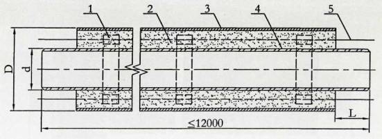 1 - стальная труба, 2 - оболочка из полиэтилена; 3 - изоляция из пенополиуретана; 4 - центрирующая опора; 5 - проводники-индикаторы системы ОДК (показаны условно).