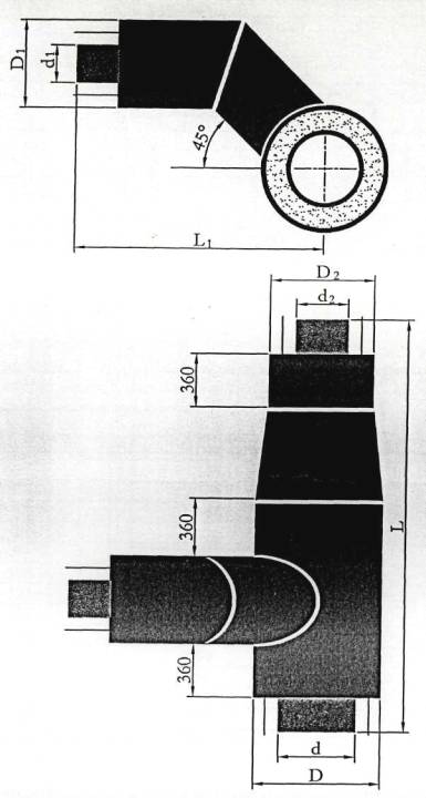 Примечания: 1. По заказу изготавливаются тройниковые ответвления с d = 32, 40, 45 мм. 2. Пример условного обозначения: Тройниковое ответвление ст. 159-108-1-ППУ-ПЭ ГОСТ 30732-2001. Изолированные тройниковые ответвления с переходами