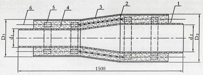 1 - стальная труба, 2 - электроизоляционная трубка; 3 - труба-оболочка из полиэтилена; 4 - изоляция из пенополиуретана; 5 - центрирующая опора; 6 - проводники-индикаторы системы ОДК (показаны условно).